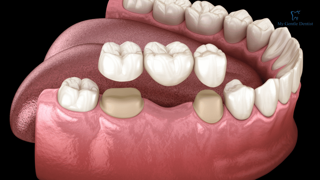 A dental bridge is a type of dental restoration that is used to replace missing teeth. Bridges are usually made from porcelain, ceramic, or metal. They consist of two or more crowns (called abutment crowns) on either side of a gap created by a missing tooth, with a false tooth (or teeth) in between. These false teeth are called pontics, and they can be made from multiple materials such as alloys, porcelain, gold, or a combination of them.