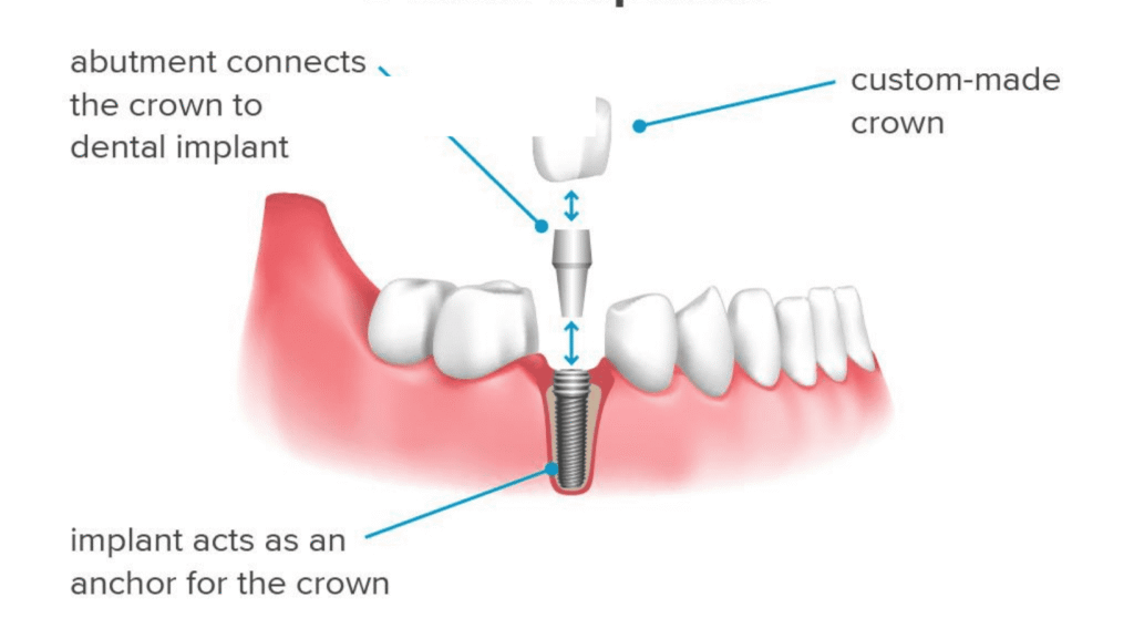 Dental implants are usually made of titanium. The metal fuses with your jawbone and provides a strong foundation for replacement teeth. Once the implant is in place, your dentist will attach a replacement tooth, called a crown.