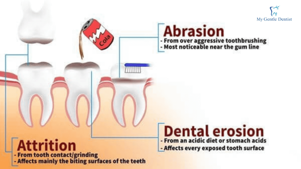 -Attrition: Attrition is caused by the grinding of the teeth. This can be caused by stress, clenching of the jaw, or bruxism (grinding of the teeth while sleeping).